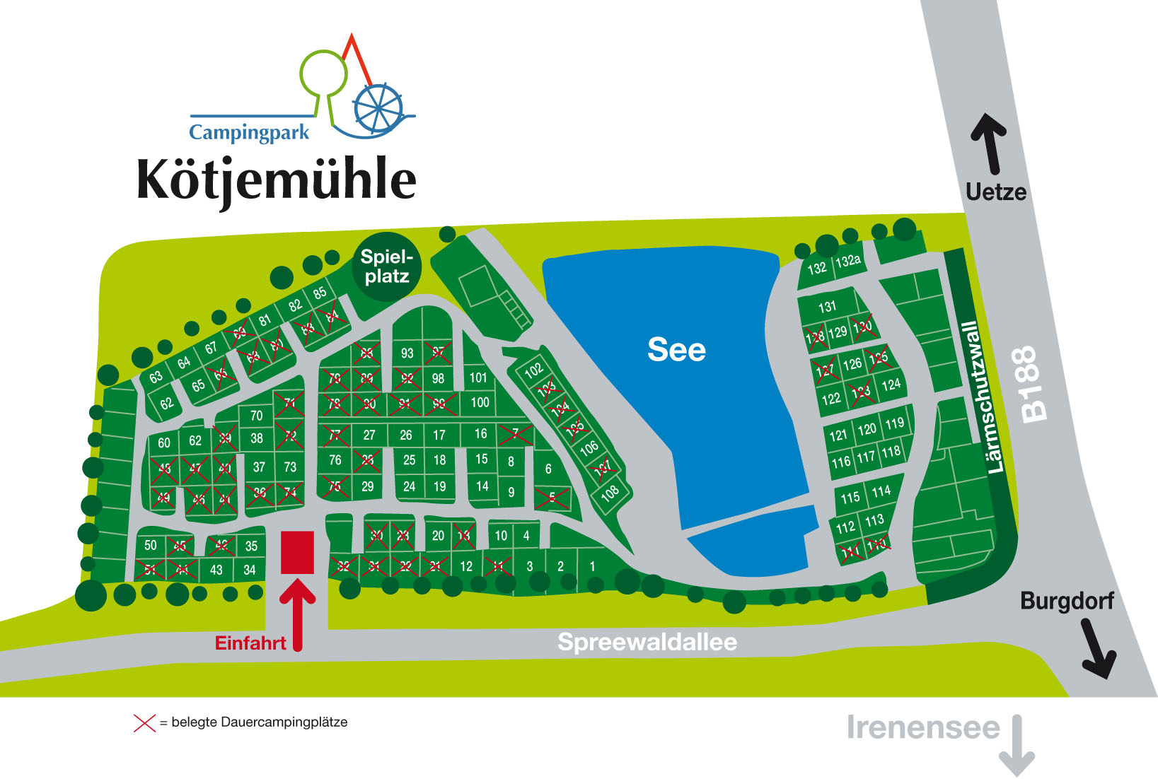 Ob offene Standplätze am See oder gemütliche Nischen - auf der Kötjemühle findet jeder unter den ca. 100 Dauercampingplätzen sein Reich.